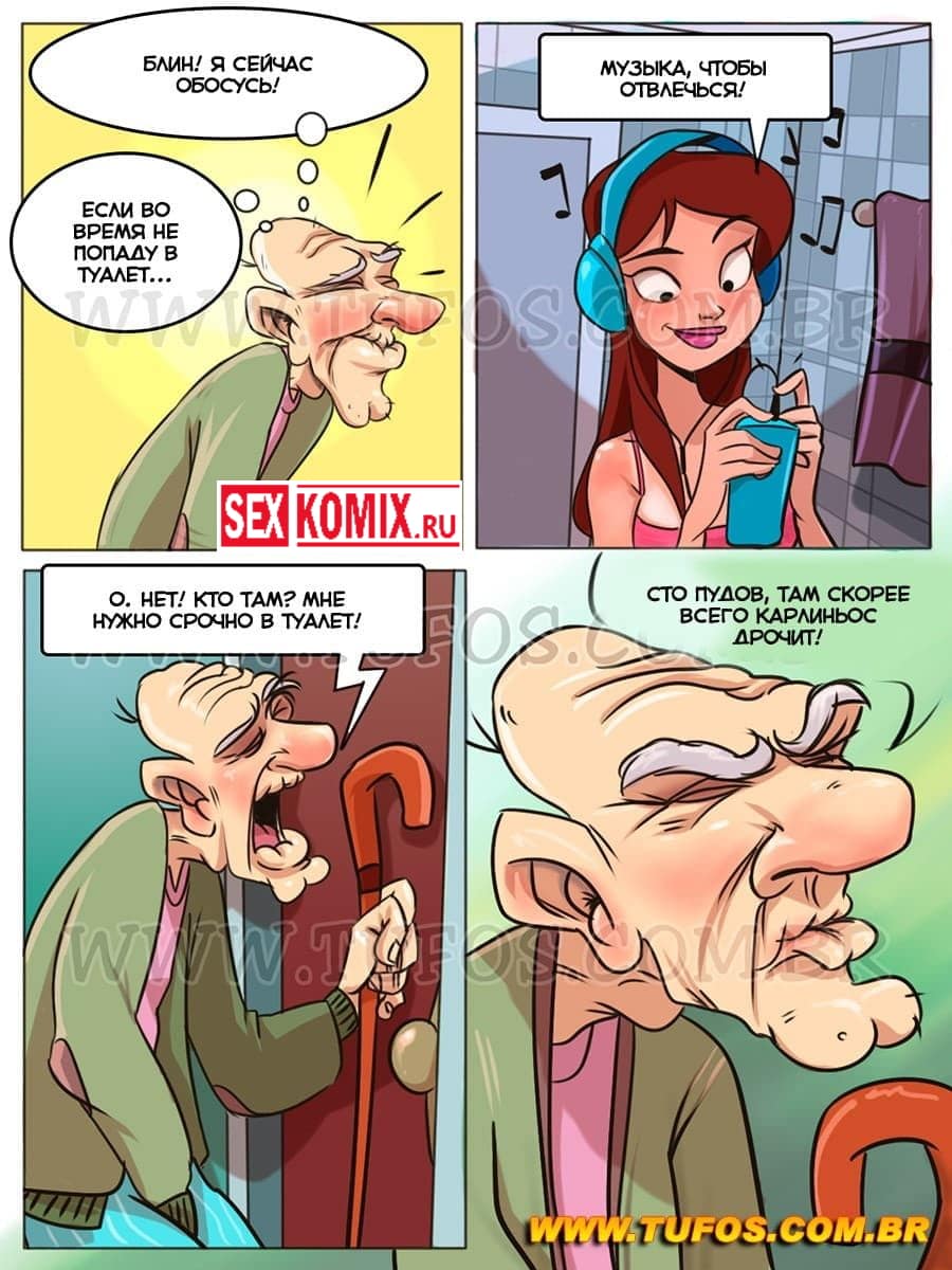 Порно комикс Похотливая семейка. Часть 3. Дедушка лучше знает. Развратный русский инцест комикс, в котором дедуля очень хочет справить нужду, но в туалете кто-то есть и не пускает старца. Деду ничего не остается, как надавить на дверь и зайти, и что же он там видит, девушка бреет свою нежную киску и слушает музыку в наушниках. Дед возбудился и вспомнил былые времена, как он трахал сочных девушек пачками, от них не было отбоя. Старик приласкался к ней, девушка из любопытства занялась сексом со своим дедом.