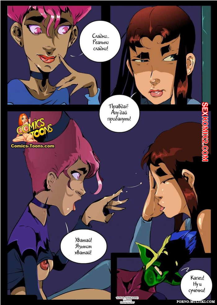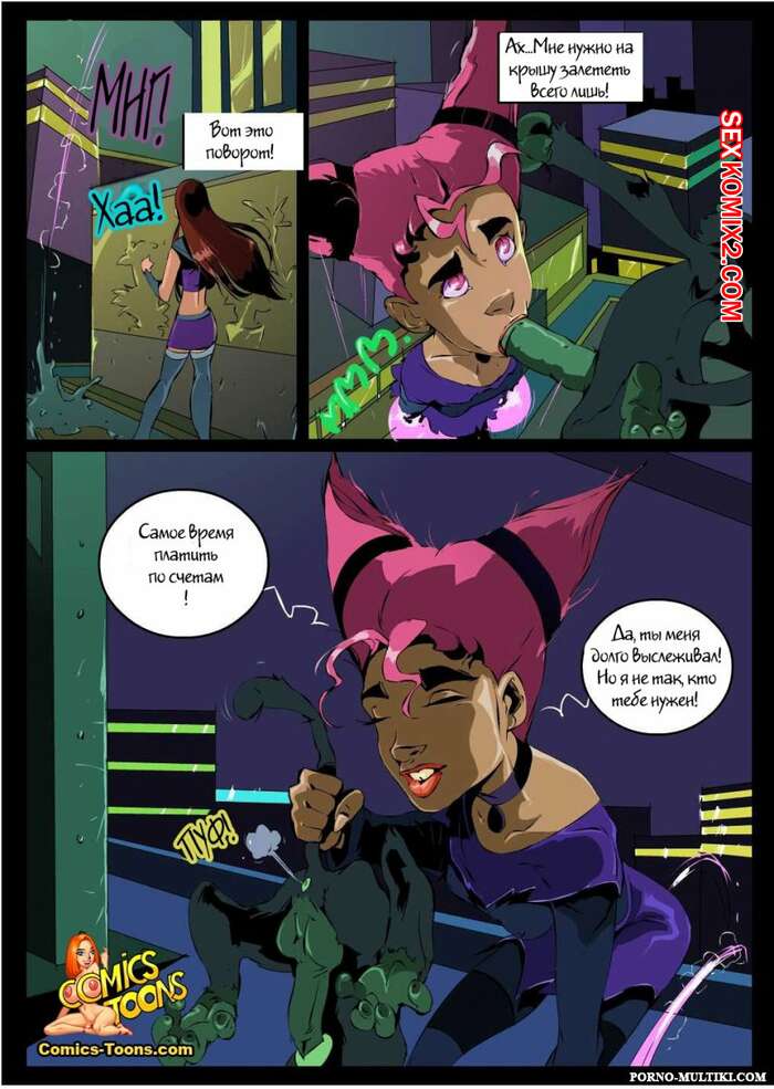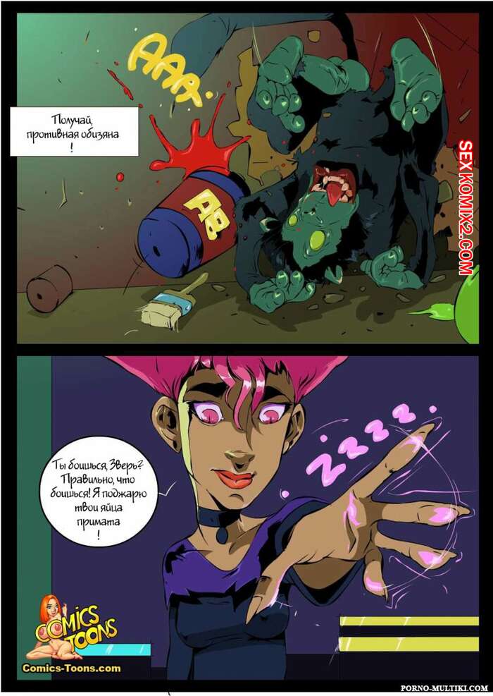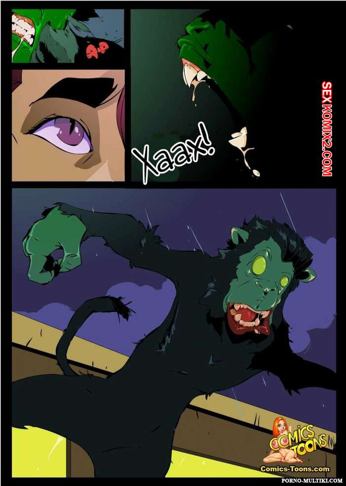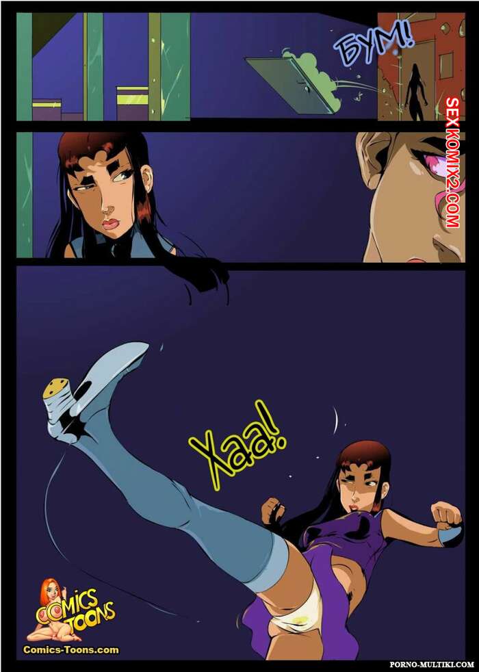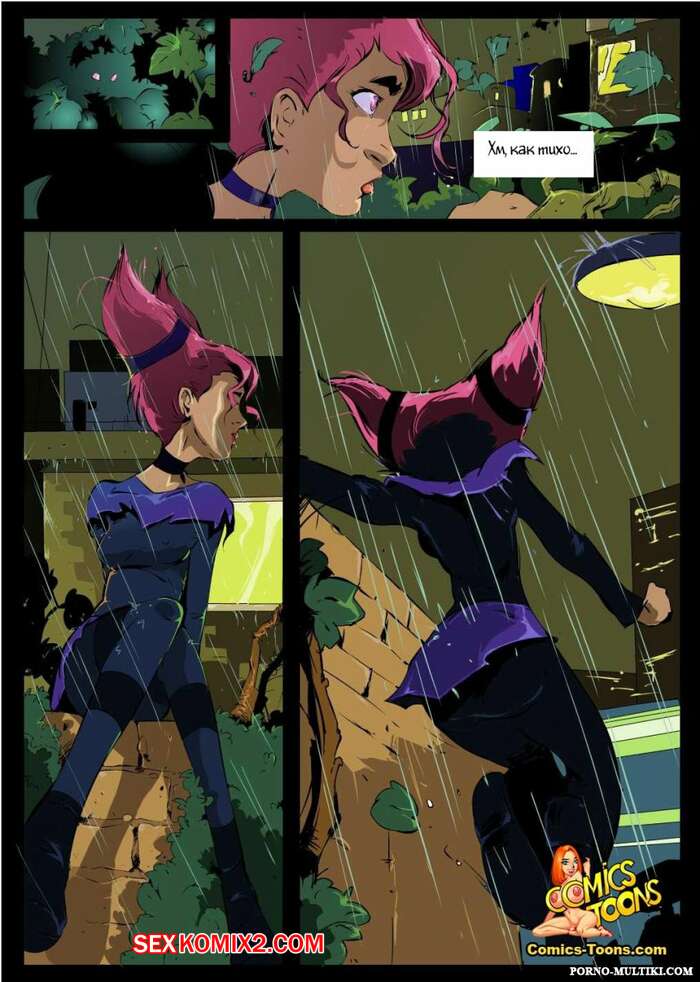 Порно комикс Титаны. Teen Titans Зверь и Рейвен подкараулили ночью горячую красотку, чтобы с ней повеселиться. Они раздели ее и дали ей у себя отлизать и отсосать, после чего занялись групповой еблей.