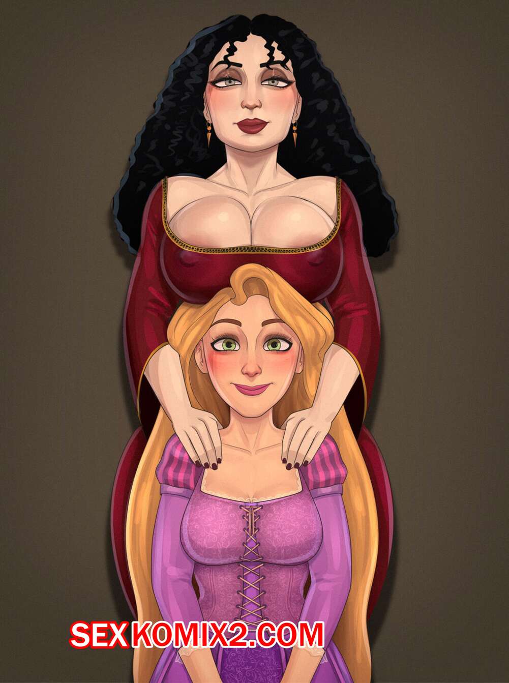 Порно комикс Матушка Готель и Рапунцель. Горячая милфа с пылающей от желания киской, подставила попку своей фута дочери для ебли. И вот хуй уже заходит куда надо.