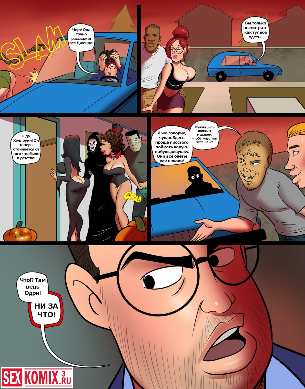 Порно комикс Спасительный хэллоуин. Горячая девушка одела костюм Лары Крофт и пошла на вечеринку в честь Хеллоуина, со своей подругой с большими сиськами. Она попросила своего отца довести их до вечеринки, и когда он высадил красоток, услышал разговор двух парней, как они хотят трахнуть его дочь. Мужчина не мог позволить этому случиться, он раздобыл костюм оборотня и проник на вечеринку. Он увидел как его дочь с двумя парнями в костюмах инопланетян пошли в спальню на втором этаже и проследовал за ними. Как выяснилось, это были настоящие пришельцы, и они трахали девушку. Мужчина прогнал их прочь, но красотка вся текла и набросилась на него.
