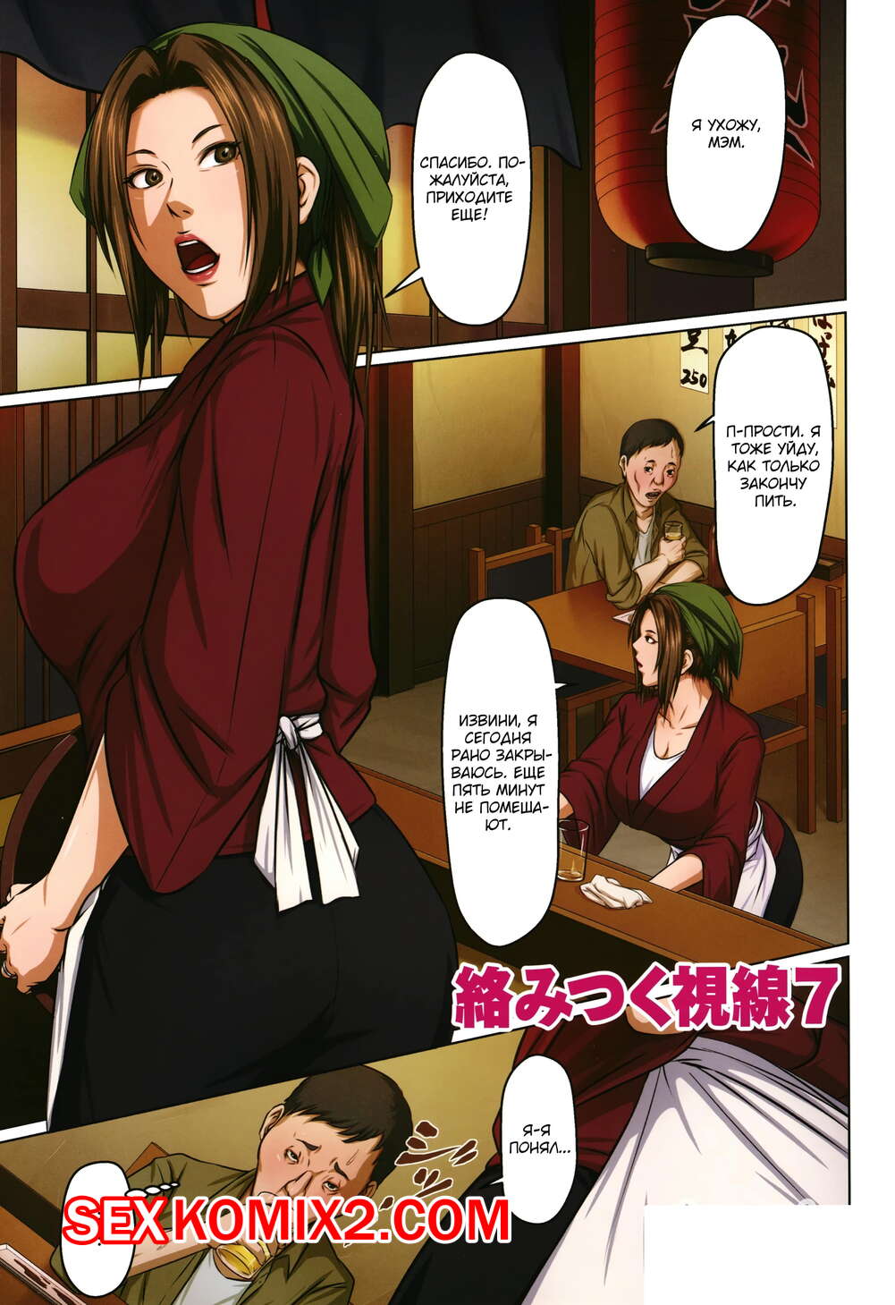 Порно комикс Запутанный взгляд. Части 7 и 8. Karamitsuku Shisen Пожилой мужик был чертовски возбуждена рядом с горячей сисястой брюнеткой и хотел ее выебать. Дама не смогла сдержаться и стала сосать хуй парня, после чего дала ему себя выебать.