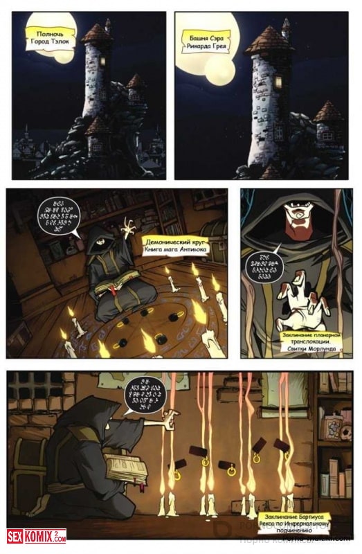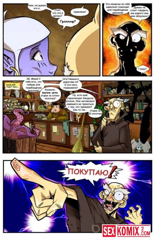 Порно комикс Порабощение демона. Часть 1. Старый маг совершил древний ритуал по призыву демона, в его доме появилась сексуальная темная эльфийкая. Она не сразу поняла где очутилась, а старый мужчина уже набросился на неё, чтобы трахнуть.