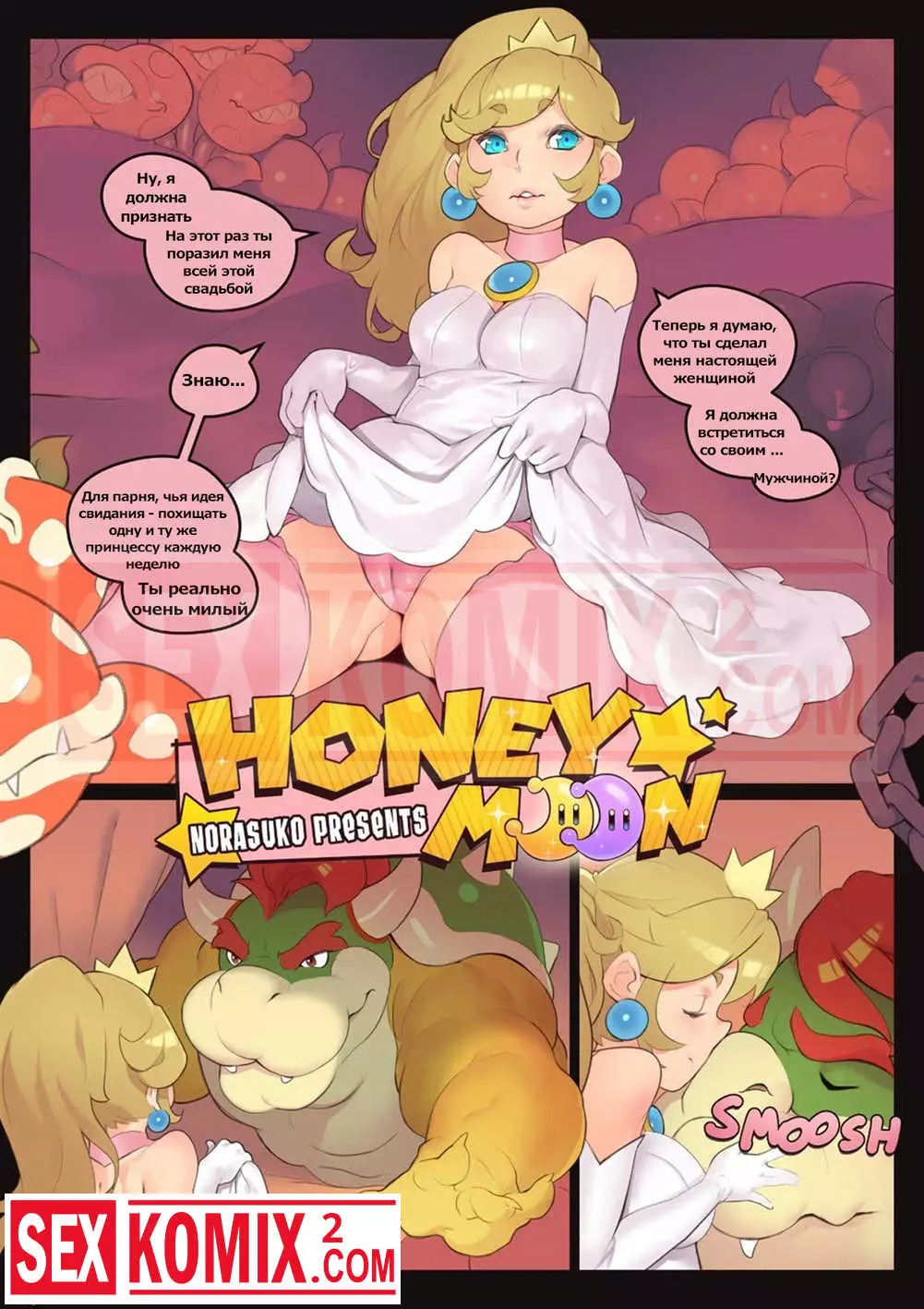 Порно комикс Медовый месяц. Злой дракон хотел жениться на принцессе Персик, и красотка ответила ему взаимностью. Но перед свадьбой захотела испытать своего будущего мужа в постели. Она сделала ему минет и как следует проверила его член в работе.