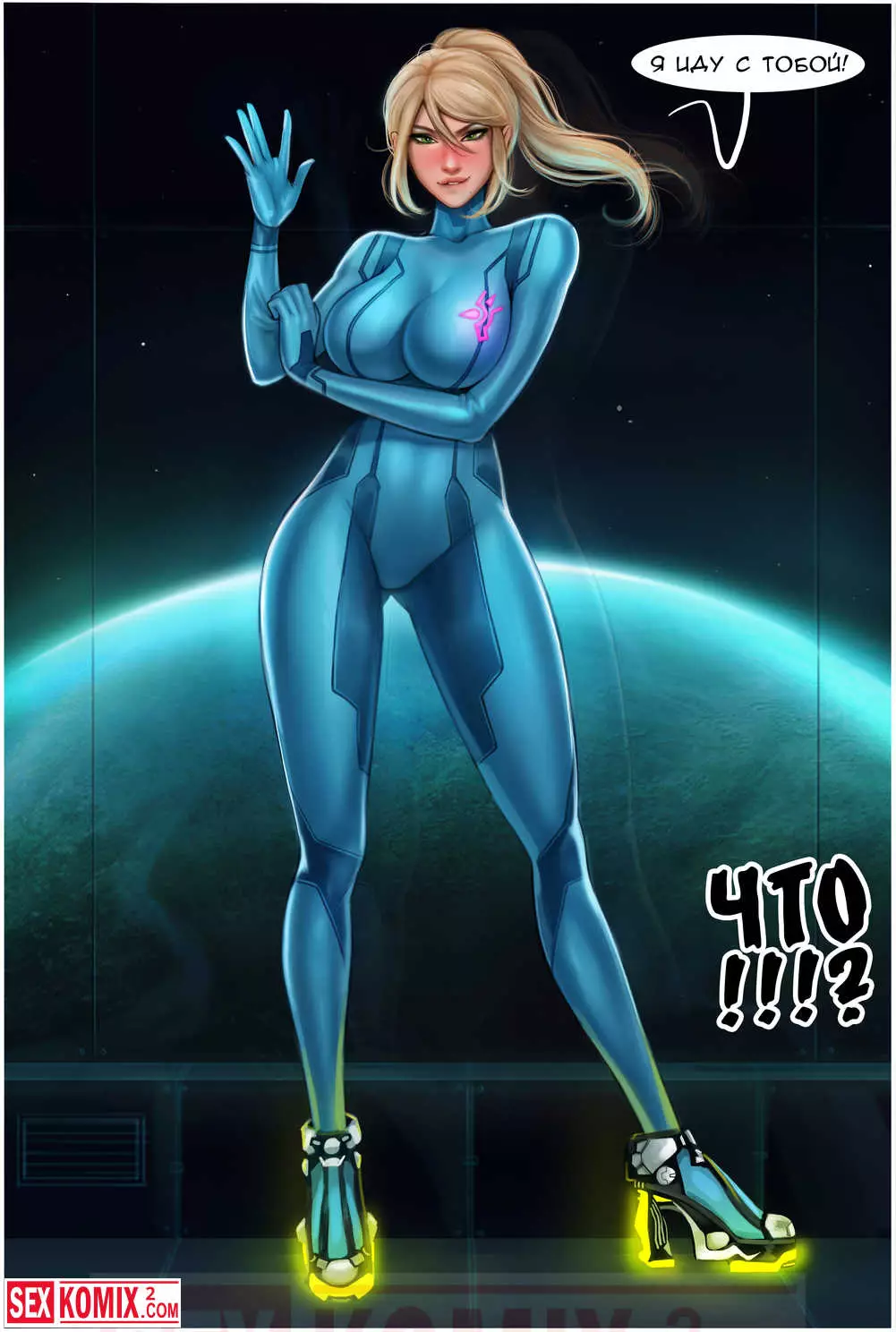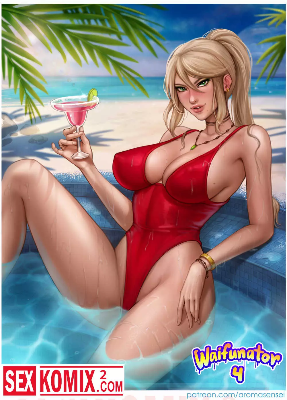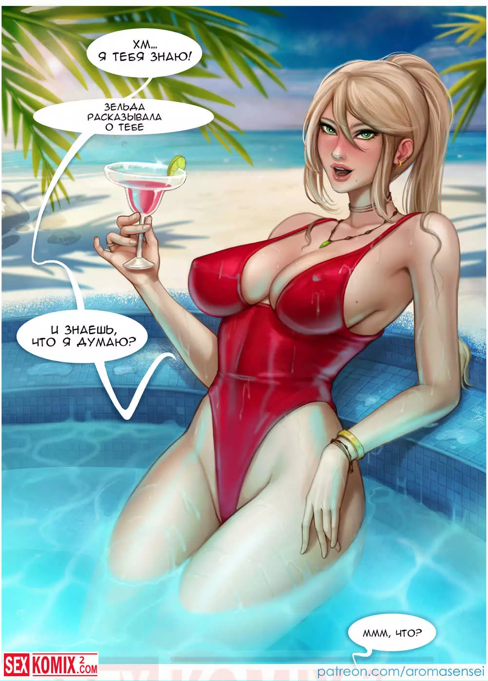 Порно комикс Вайфунатор. Часть 4. Metroid. Высокая блондинка расслаблялась в бассейн и пила коктейль, её побеспокоил какой-то парень и соблазнил на секст. Он трахнул красотку в это же бассейне.