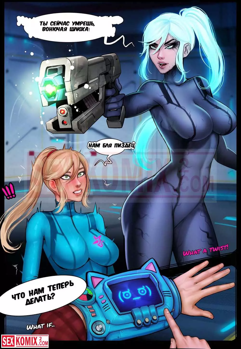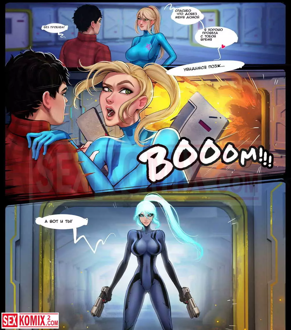 Порно комикс Вайфунатор. Часть 6. Красотка со своим другом хотели заняться сексом на улице, но раздался сильный взрыв и они увидели странную девушку в обтягивающем костюме. Они хотела секса с разу приступила к делу.