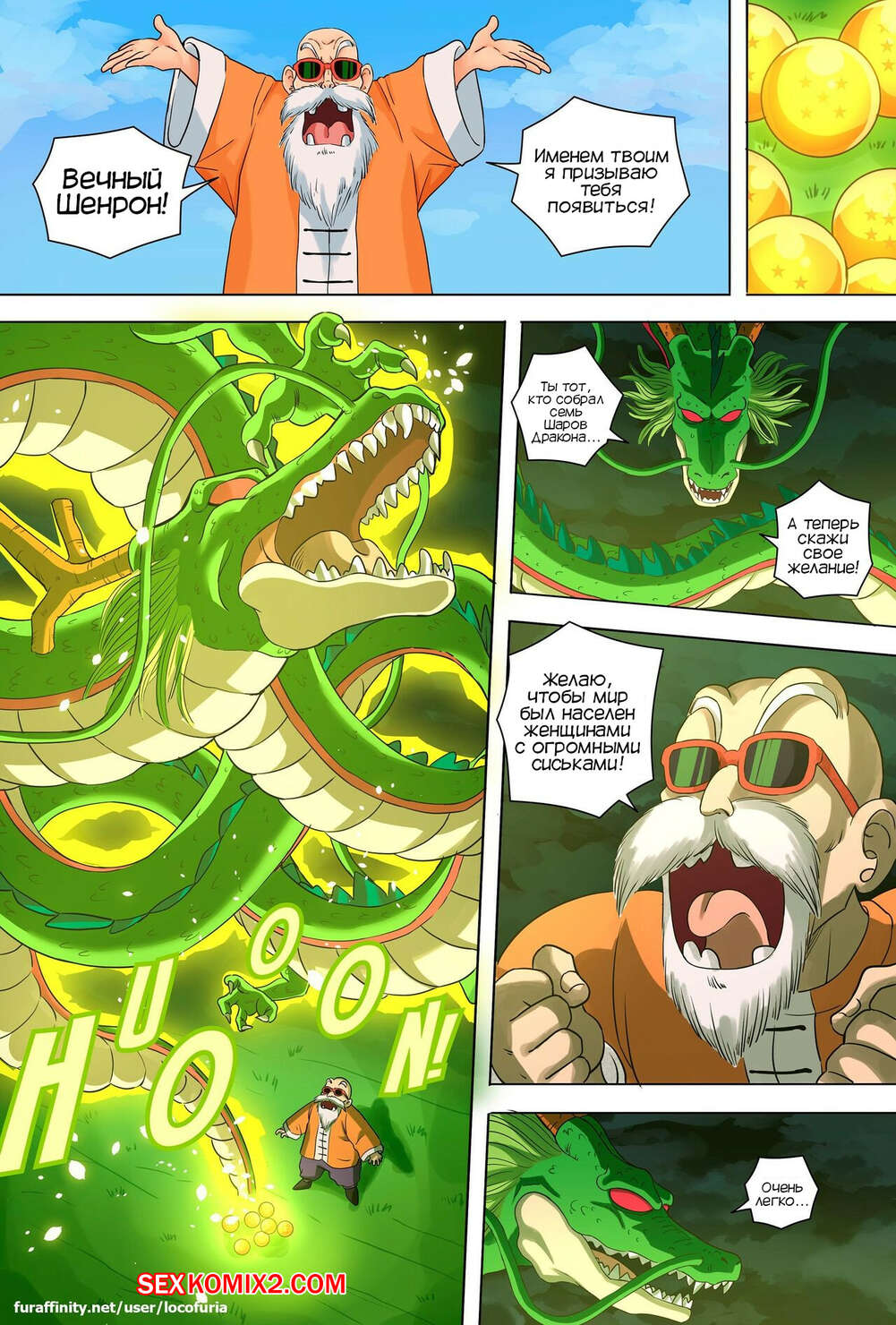 Порно комикс Dragon Ball. Неправильное желание. Часть 2. Wrong Wish. locofuria Мастер Роши собрал все Шары Дракона и загадал желание, но все пошло не совсем по его плану. У парней стали пропали члены, а вместо этого появились вагины и большие сиськи.