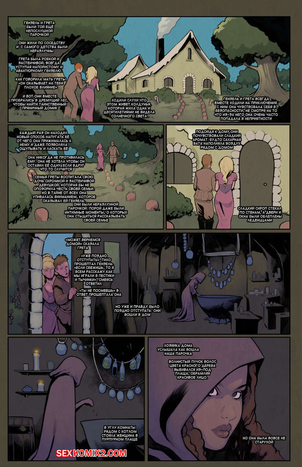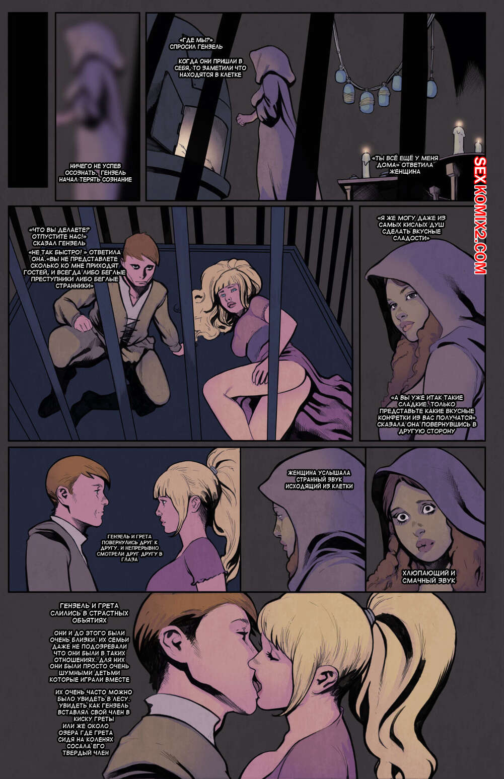 Порно комикс Grimms Girls in Fairyland Tales. Часть 3 Гензель и Грета попали в плен к ведьме, которая решила с ними повеселиться. Девушки разделись и отсосали большой хуй парня, после чего он их хорошенько выебал.