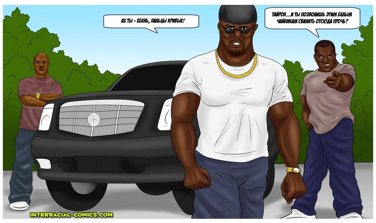 Порно комикс «Возмещение ущерба». Простой парень со своей женой, сексуальной блондинкой ехали по трассе и случайно зацепили соседнюю машину. Это был джип, из него вылезли чернокожие братки и потребовали денег за нанесенный ущерб. Парень зарабатывает не много и у него нет столько денег, но парням приглянулась его горячая жёнушка и они предложили трахнуть её в замен денег. Несчастному не хотелось подставлять свою спутницу, но выбора у него не было, тем более от виды накаченных черных тел девушка уже возбудилась и её трусики были мокрые.