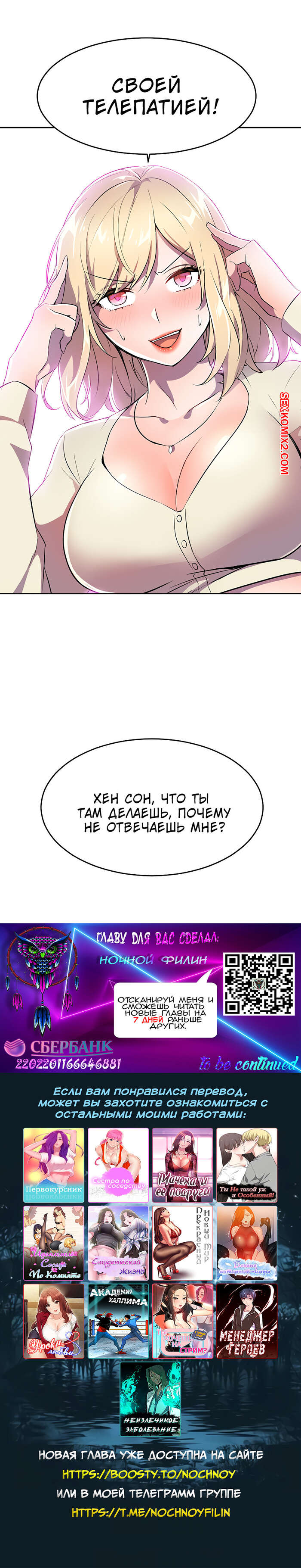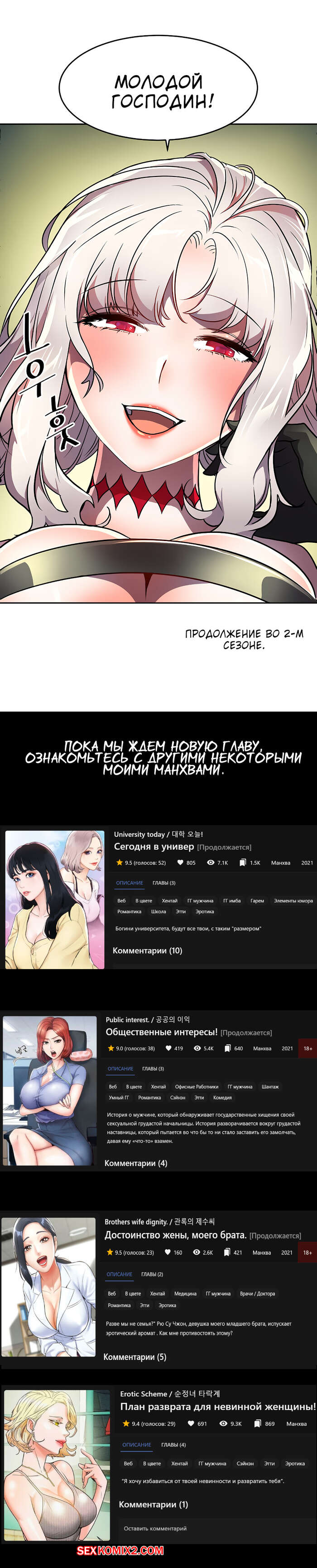 Leronson2022-07-18Шёл 1647590537 день, как у нас нет проды этой манхвы. У нас уже давно закончились годные проекты, про остальные комиксы филина я молчу. Нам нужно продолжение этого комикса. В последнее время так много всякого хлама. И ни одного глотка свежего, прекрасного, всезаполняющего сюжета, который тебя окутывает, и погружает тебя с головой в самую свою пучину. Так что я расстроен. И надеюсь на продолжение этой манги)