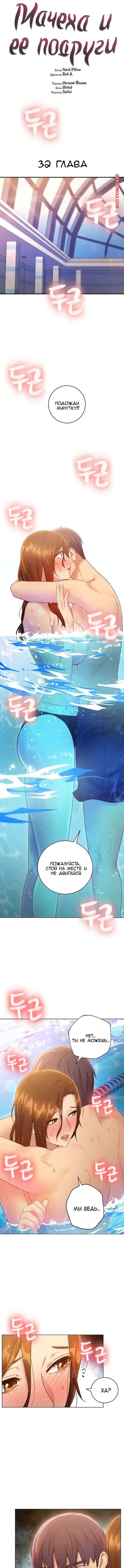 Порно комикс Мачеха и ее подруги. Части 31 и 32 и 33. Stepmother Friends Мачеха решила сводить своего пасынка в бассейн, чтобы помочь ему расслабить свои мышцы. Там она стала делать ему массаж, от которого у парня возник дикий стояк. Да еще и сиськи его мачехи оголились и он стал прикрывать ее своим телом. Потом его мамка привела его на встречу со своей подругой, которая позволила ему потрогать ее сиськи в обмен на ответ на интересующий ее вопрос.