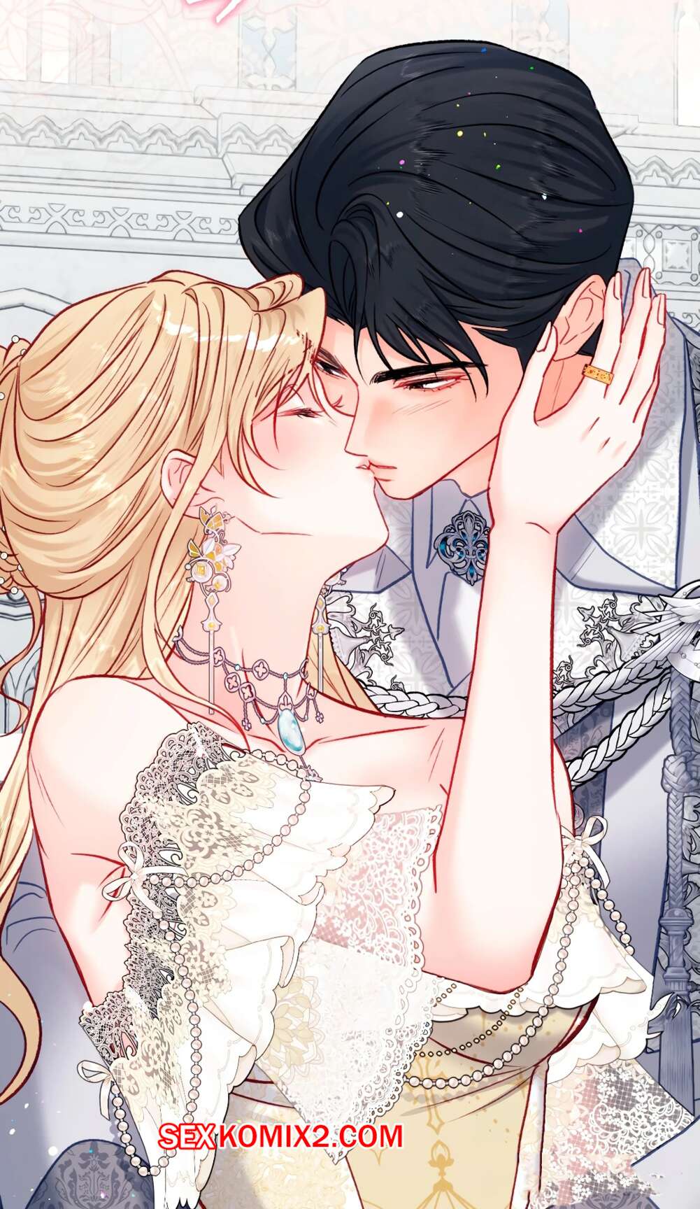 Порно комикс Я оказалась заперта в игре гаремнике. Без цензуры. Часть 23 Блондиночка ждет своего дружка и надевает пышное платье, чтобы его удивиться. Он подходит сзади к красотке и шепчет ей на ухо комплименты, после чего страстно целует девушку.