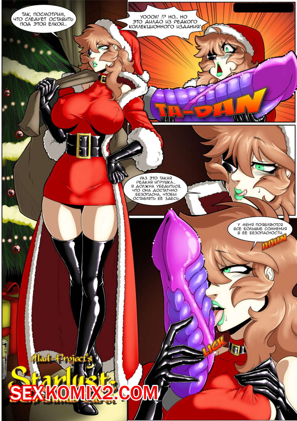 Порно комикс Starlust. a Christmas Carol. Рождественская песня Красотка получила в подарок на Рождество огромный дилдо, о котором очень давно мечтала. Она не могла тянуть с его пробой, так что сразу разделась и села своей пиздой на него полностью.
