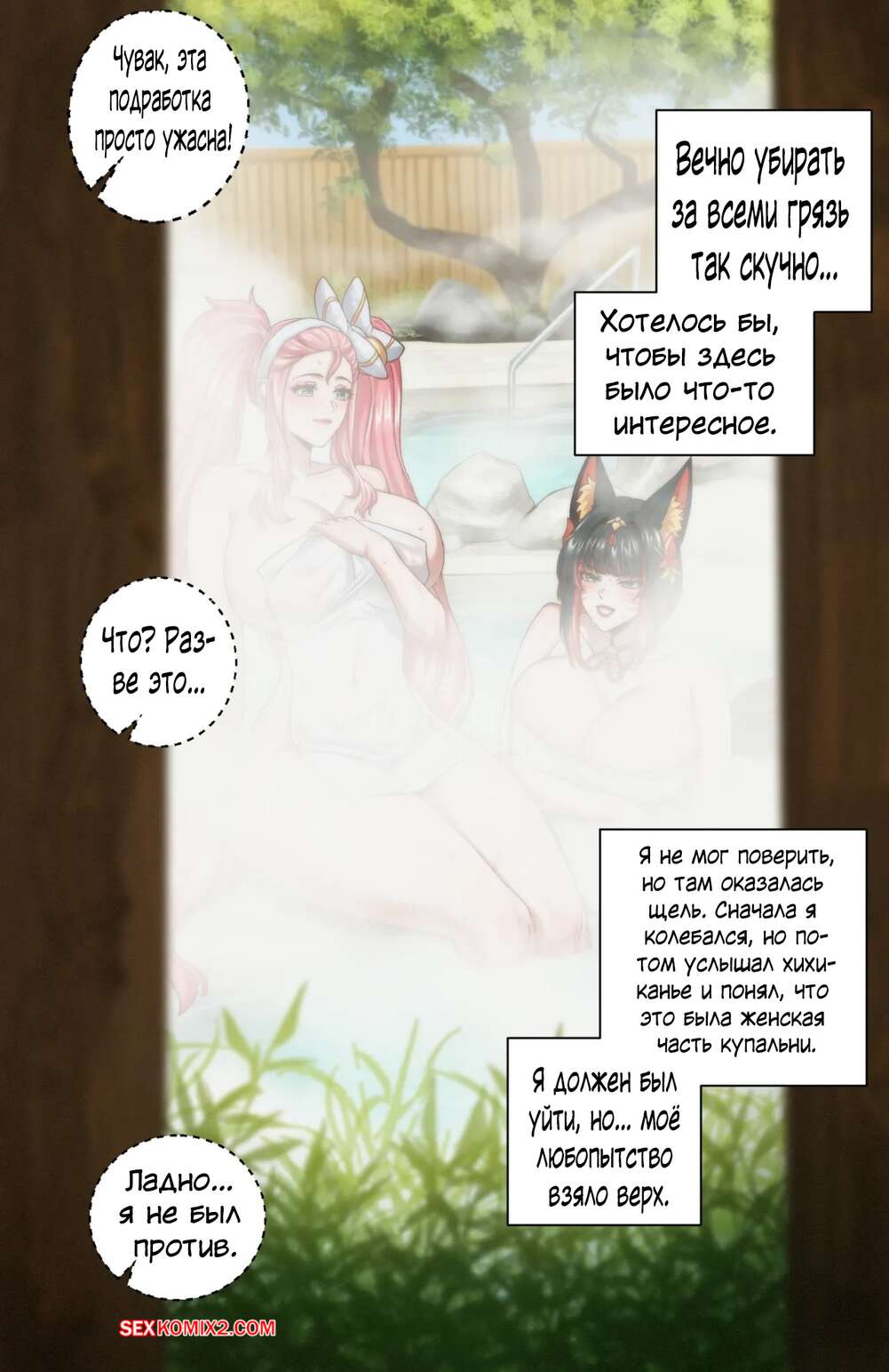 Порно комикс League Of Legends. Подглядывание за Ари и Соной. Ryuukusnpaiart Две горячие подруги отдыхали на горячих источниках и парень за ними подглядывал. Девушки решили пошалить и стали страстно целоваться, после чего занялись лесбийской еблей.