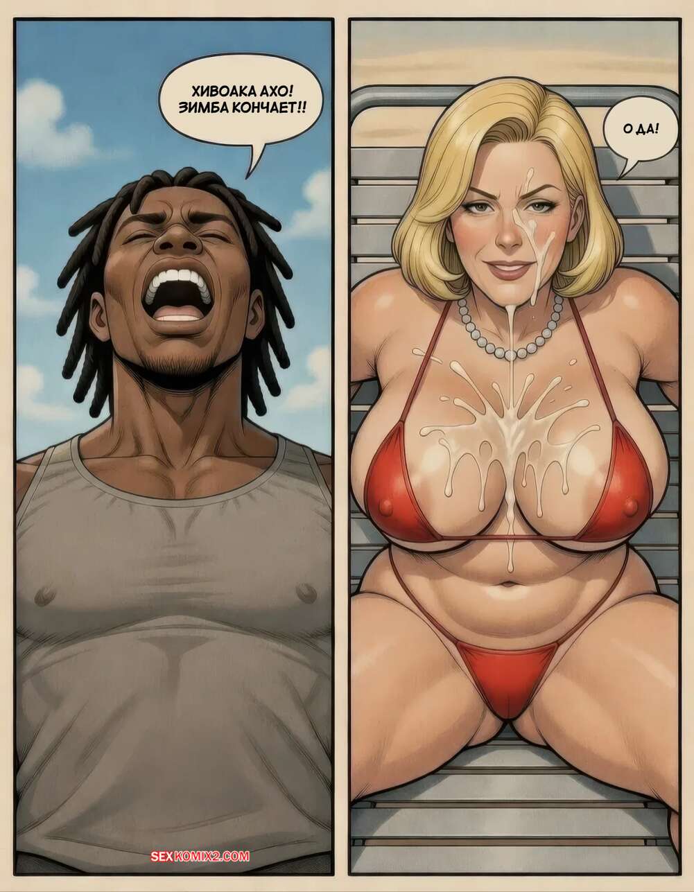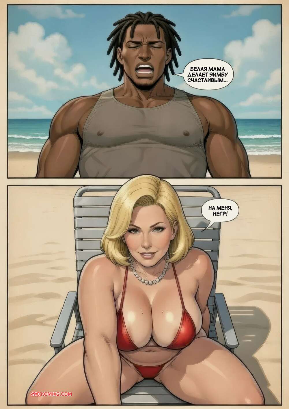 Порно комикс Хобби Кристи. Kristys Pastime. Pine. Горячая милфа пришла на пляж, где к ней подкатил темнокожий парень. Сучка стала ему отсасывать, после чего позвала его в уединенное место, чтобы потрахаться и кончить в нее.