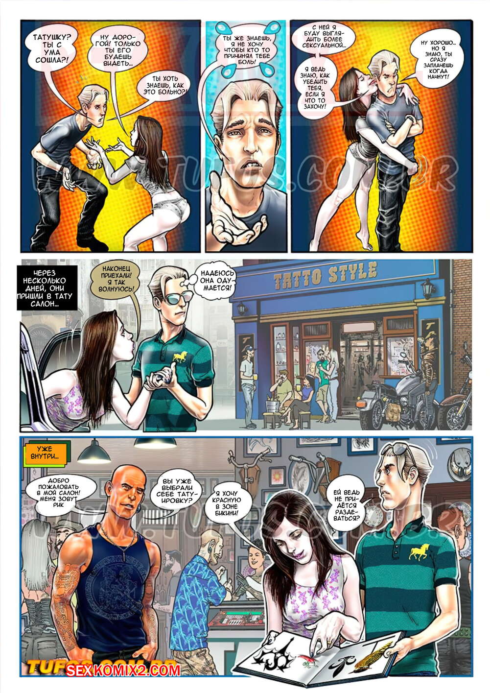 Порно комикс Истории об изменах. Часть 8. Пикантная татушка красного чили перца Красотка вместе с парнем отправилась делать себе татуху. Пока парень ждал, девушка осталась наедине с лысым накаченным татуировщиком. Так как ее татуха находилась в откровенном месте, ей пришлось раздеться, от чего мужик быстро возбудился.