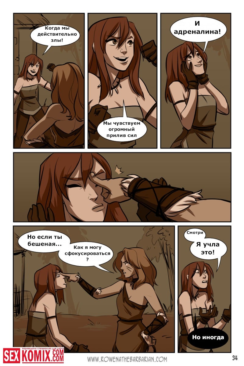Порно комикс Ровена Варвар. Две путешественницы встретили в таверне мужчину, который просил помощи, т.к неизвестные похитили его сестру. Девушки согласились помочь. Найдя в лесу пленницу, они увидели что девушка привязана к камню и над ней хотят совершить обряд. Извне появился демон с большим членом и решил лишить девушку девственности. Тут началась битва, и демон захватил одну из путешественниц и трахнул её своим огромным членом.