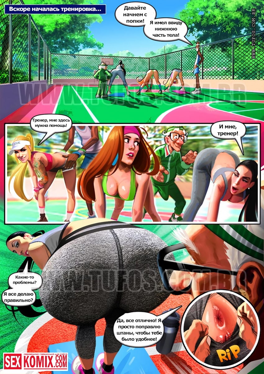 Порно комикс Удалые старички. Часть 6. Уличный фитнес. Два развратных старика прогуливаясь в парке солнечным днём, увидели сексуальных девушек в обтягивающих спортивных костюмах. Они занимались фитнесом прямо на улице, мужчины напросились к ним и присоединились к занятию. Девушкам было интересно наблюдать за двумя стариками, не имеющими выполнить сложные упражнения. У одного из них случайно из штанов выпал член и они были шокированы тем, какой он огромный.